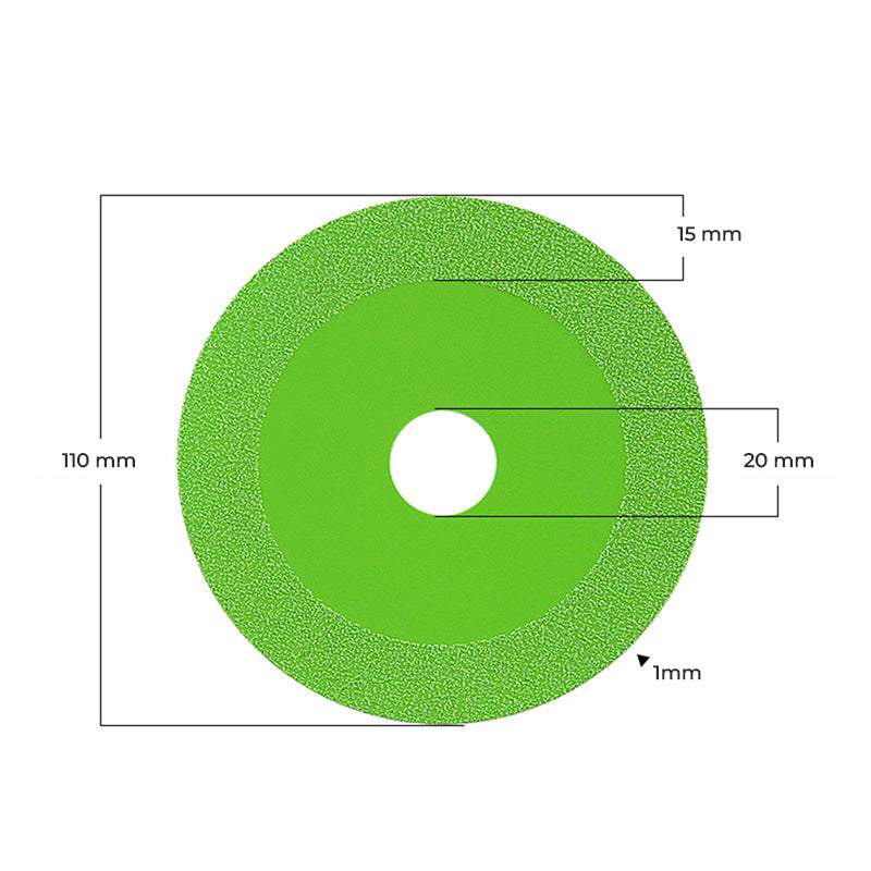 Ova visokokvalitetna dijamantna rezna ploča dizajnirana je za precizno rezanje i poliranje stakla, mozaik pločica i kamena. Sa svojom tankom debljinom od samo 1 mm i dijamantnim obručem visine 15 mm, ova ploča omogućava brzo i čisto rezanje uz minimalno usitnjavanje.