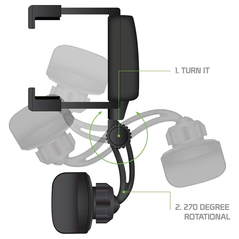Posebno je dizajniran s čvrstim zaključnim gumbom koji zaključava vrat držača i može se podesiti pod bilo kojim kutem od 270 stupnjeva. Tanak, lagan i kompaktan, proizvod se praktično objesi na unutarnje ogledalo, čime se održava uredan prostor na kontrolnoj ploči, vjetrobranskom staklu i prostoru za čaše. Nježne gumene obloge na držaču pružaju zaštitu uređaja od ogrebotina i oštećenja, a podesive kopče ogledala također su obložene zaštitom, ne klize i čvrsto drže uređaj na mjestu tijekom vožnje.