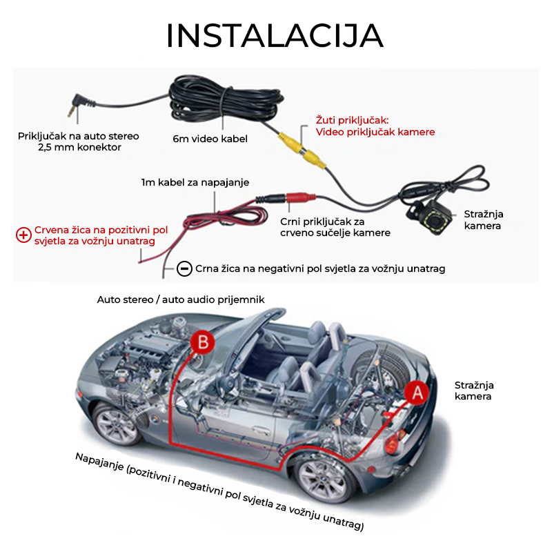 - Napajanje: Spaja se na stražnja svjetla automobila (DC 12V).