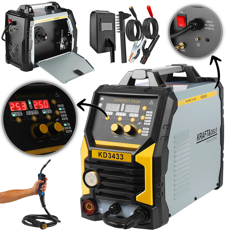 Invertorski aparat za zavarivanje moderan je i višenamjenski uređaj koji se može koristiti i u kućnim radionicama i u profesionalnim servisima. Omogućuje zavarivanje metodama MIG/MAG, MMA i Lift-TIG, što ga čini iznimno svestranim alatom. Zahvaljujući funkciji SYN MIG, uređaj automatski prilagođava parametre zavarivanja, što uvelike olakšava rad i manje iskusnim korisnicima.