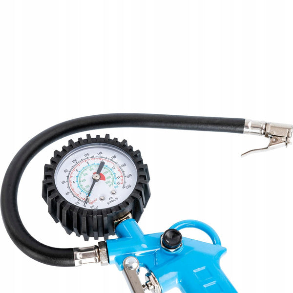 Pištolj za pumpanje guma omogućuje jednostavno i precizno napuhavanje guma. Manometar se koristi za provjeru tlak u gumama.