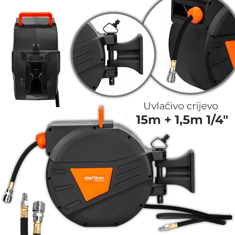 KD2158 je kompaktno pneumatsko crijevo marke KRAFT&DELE duljine 15 m + 1,5 m, smješteno na automatskom kolutu. Namijenjeno je radu sa komprimiranim zrakom u radionicama, servisima, garažama i industrijskim pogonima.