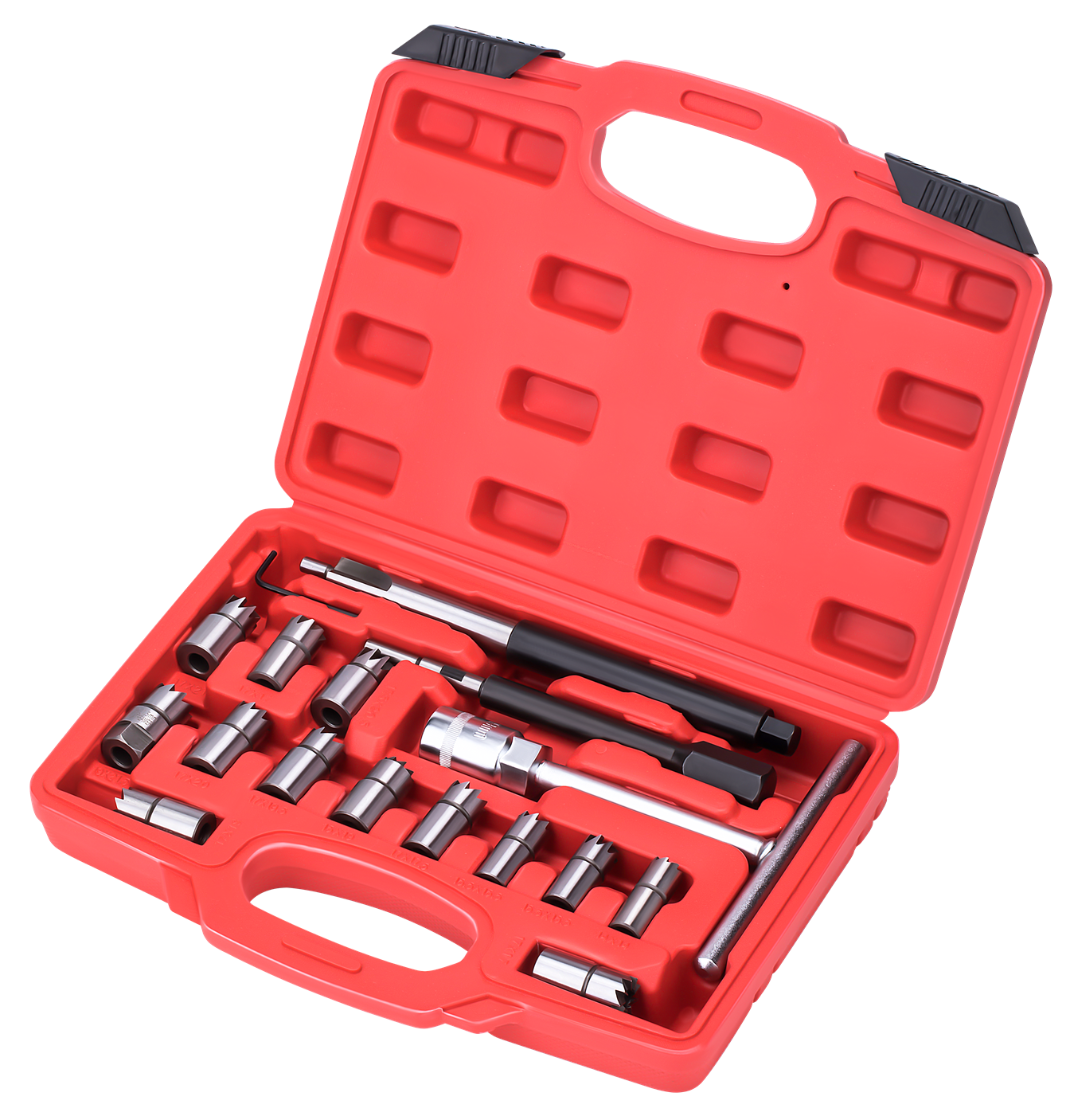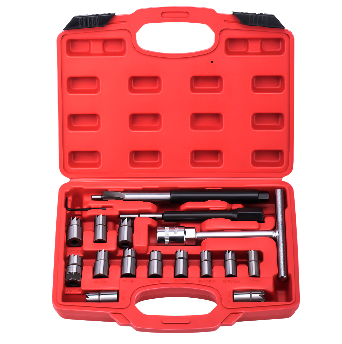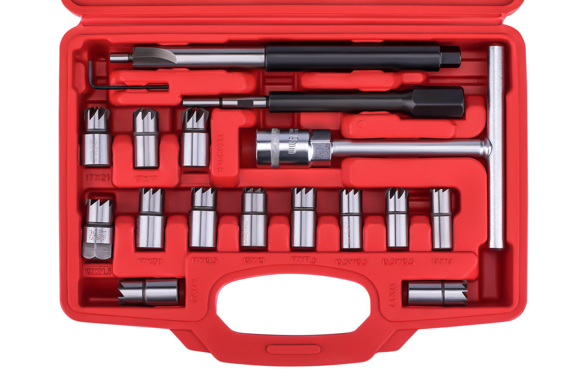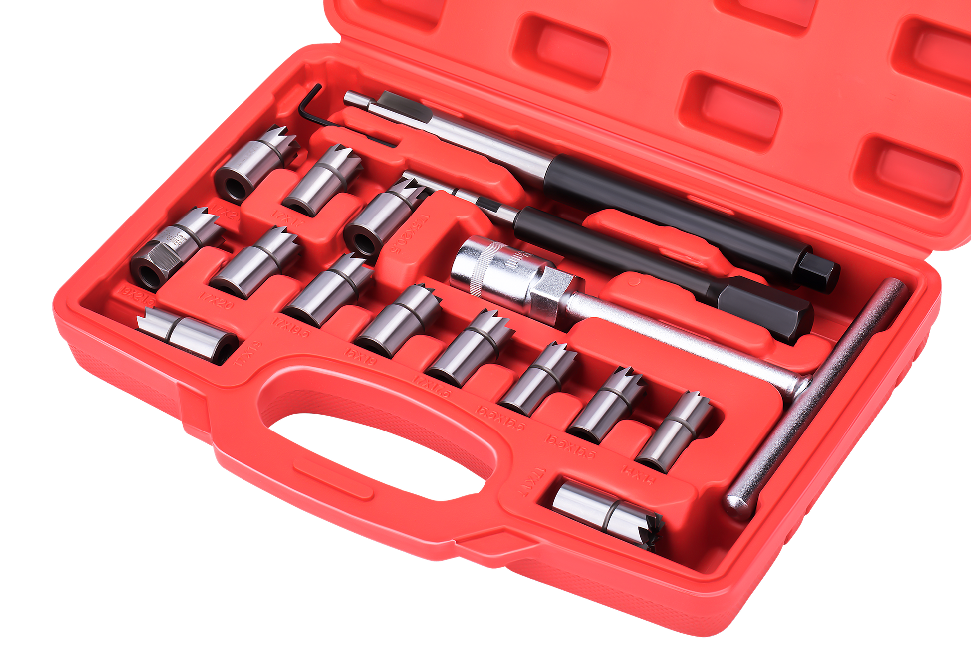 Profesionalni 17-dijelni set freza namijenjen je čišćenju, poravnavanju i dekarbonizaciji gnijezda injektora. Uklanja naslage nagara koje uzrokuju propuh, gubitak kompresije i curenje ispod podložne pločice, čime se sprječavaju ozbiljnija oštećenja motora.